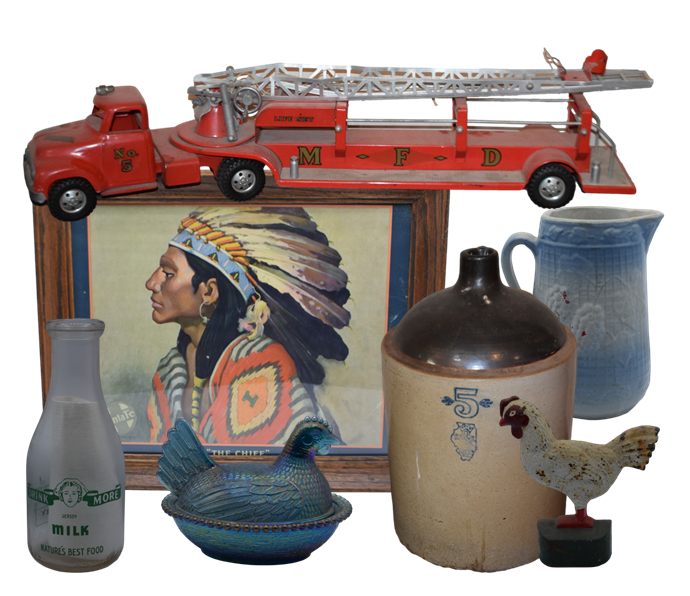 Dazey Butter Churn – Granite Ware Coffee - Chalk Nativity –Paper Mache Santa – Honey & Bee Related Collectibles –Nesco Tin Match Safe – Purina 1gal Galvanized Bucket – Mikro Scale – Copper Mugs – Antique Photo Albums – Premium Cracker Tin – Terracotta Figurines – Coffee Jars – Mid-Century Coffee Pot – Various Granite Ware – Various Chicken Figurines – Vintage Egg Scale – Brass Corn Plaque – Wooden Whirly Gigs – Tin Farm Animal Hooks – Vintage Orange Juice Carafes – Kitchen Scale – Copper Boiler – Wood Boxes – String Holders – Advertising Tins – Coffee Grinders – Exit Light – Pully – Torch Lantern – Milk Bottles – Antique Kellogg Wall Phone – Balance Scales – Antique Apple Peeler – Black Forest Barometer – Burnt Wood Pipe Box – Root Mason Jar – Egg Basket – Willard Storage Batteries Sign – Burma Shave Wooden Sign – Wash Boards – Oil Lamps – Quilts – Fountain Pins - Uncle Sam’s Cash Register Coin Bank – Buddy L Toy Trucks – International Toy Grain Truck – Tonka Fire Engine Truck No 5 – Tin Kitchen Stove Toy - Other Vintage Toys – Depression Glass Shakers – Green Vaseline Juicer – 4c Custard Measuring Cup – Carnival Glass Hen on Nest – Jadeite Planter – Enamel Painted Vase – Carnival Glass Honey Dish - Black Americana Cast Iron Bank – Cast Iron Rooster Doorstops – Cast Iron Match Safe – Salesman Sample Size Boiler – Griswold No 9 Skillet Lid – Cow Doorstop - Griswold Skillet Lid – Salesman Sample Crescent, Acme & Queen Stove – White Painted Bell – Griswold Crispy Corns – German Shepherd Bookends - Neefs Dairy Bottles (quarts & pint) – Craigs Dairy Bottle – Roy Utz Thermometer – MoPac Lantern Globe – Alvin Bozarth, Boonville, MO Box – History of Cooper County - Butteryfly Salt Crock – 10” Blue/White Banded Crock Bowl – Watts Ware – Large Selection of Stoneware Pitchers – American Bisque Cookie Jar – Crock Rice Jar (no lid) – Green Crock Steins – Yellow Ware – McCoy Strawberry Cookie Jar – Pie Birds – 6gal Pittsburg Diamond Crock – Crock Bowls – Vintage Apple Cookie Jar – Majolica Water Lily Vases – Bamboo Planter – 4gal Brown Crock – Planters – Tea Pots – 5gal Blue Band Crock Jug – 4gal Crock Butter Churn – 10gal White Hall Crock – Crock Honey Pot – Indian Pottery – Fiesta Pitchers – Ball Pitcher – 6gal Crock – 3gal Diamond Crock – 5gal Crock Lid – 5gal White Hall Crock Jug – Vintage Apple Shakers – 4gal Western Crock – Brown Crock Jars – 1gal Western Crock Jug – UCO Crock Feeder – Framed Santa Fe Southwestern Calendar Pages – Boonville Depot Print – Bingham “Stump Speaking” Framed Print – Native American Framed Prints – Vintage Framed Fruit Print – KC Stockyard Framed Card – J.R. Hamil Prints – Inlaid Wood Panel – Boonville Prints – Thomas Hart Benton Print – Other Framed Art - New Haven Kitchen Clock – Antique Wall Clock – A-Frame Trusses – New Home Sewing Machine – Church Pew – Magic Chef Gas Stove – Bonnet Dresser – Cast Iron Table Lamp – Antique Baby Buggy This is a partial listing. Watch for additional photos as sale date approaches.